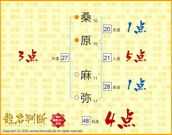 桑(10画)原(10画) 麻(11画)弥(17画)