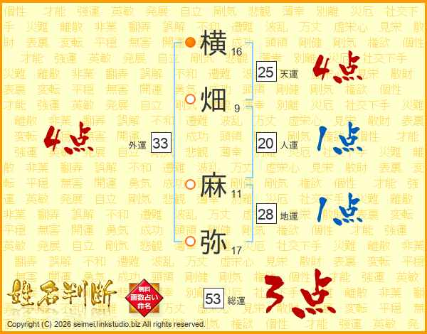 横(16画)畑(9画) 麻(11画)弥(17画)