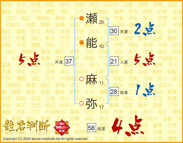 瀬能麻弥さんの総運は58画の4点!