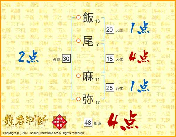 飯(13画)尾(7画) 麻(11画)弥(17画)