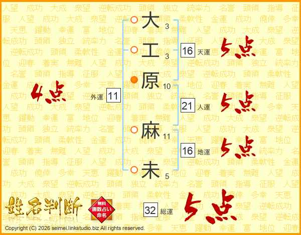大工原麻未さんの総運は32画の5点!