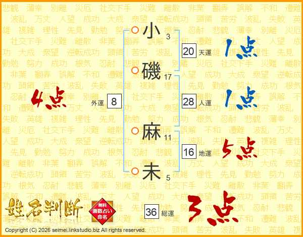 生活面を象徴する運勢です。外部から受ける影響力を表し、結婚運、家庭運や職場、環境への順応性を表します。総運から人運を引いた画数。姓や名が1文字の場合を除く。