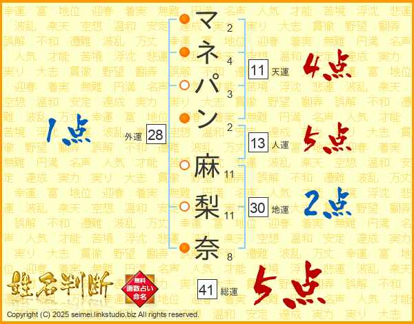 マ(2画)ネ(4画)パ(3画)ン(2画) 麻(11画)梨(11画)奈(8画)
