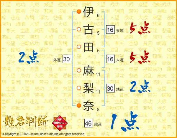 伊(6画)古(5画)田(5画) 麻(11画)梨(11画)奈(8画)