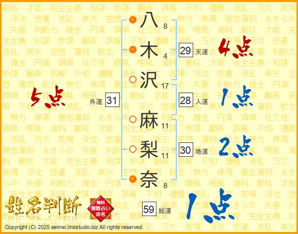 八(8画)木(4画)沢(17画) 麻(11画)梨(11画)奈(8画)
