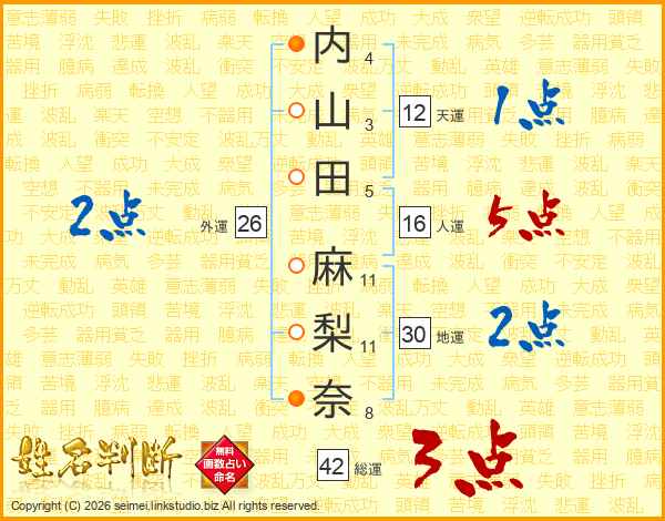 内(4画)山(3画)田(5画) 麻(11画)梨(11画)奈(8画)
