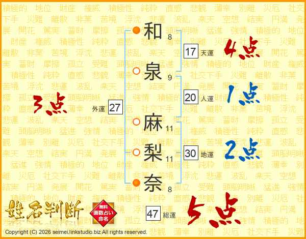 和(8画)泉(9画) 麻(11画)梨(11画)奈(8画)