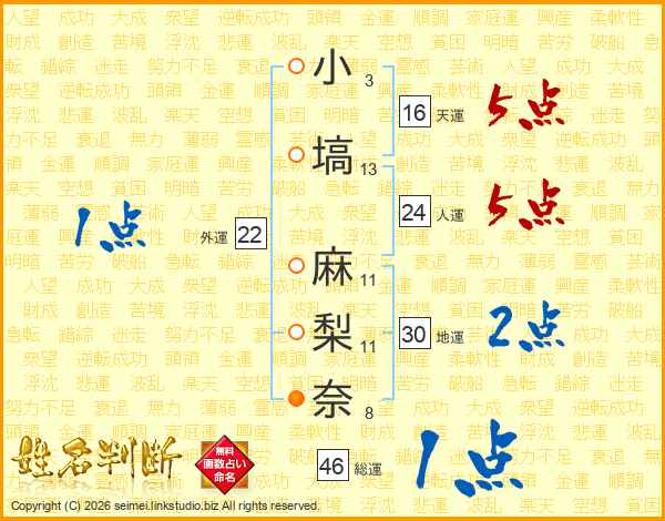 小(3画)塙(13画) 麻(11画)梨(11画)奈(8画)