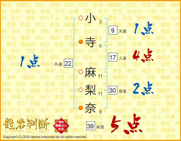 小(3画)寺(6画) 麻(11画)梨(11画)奈(8画)