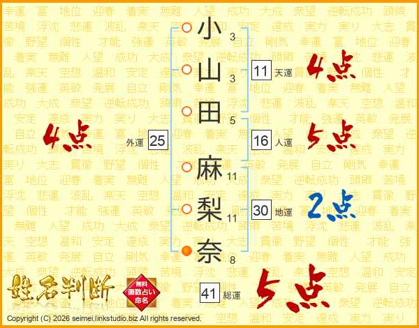 小(3画)山(3画)田(5画) 麻(11画)梨(11画)奈(8画)