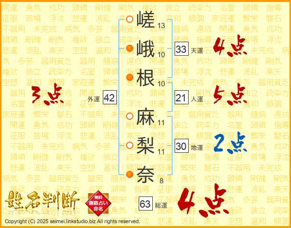 嵯峨根麻梨奈さんの総運は63画の4点!
