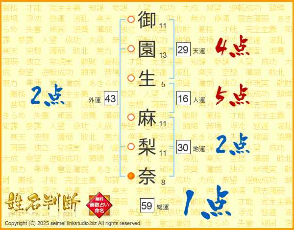 御(11画)園(13画)生(5画) 麻(11画)梨(11画)奈(8画)
