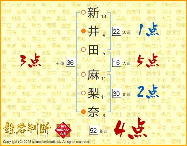 新井田麻梨奈さんの総運は52画の4点!