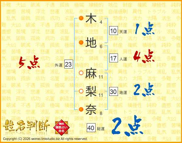 木(4画)地(6画) 麻(11画)梨(11画)奈(8画)