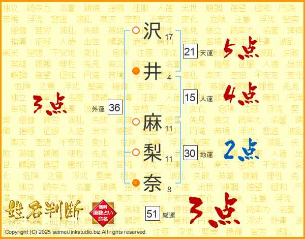 沢(17画)井(4画) 麻(11画)梨(11画)奈(8画)