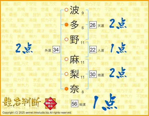 波(9画)多(6画)野(11画) 麻(11画)梨(11画)奈(8画)
