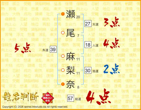 瀬(20画)尾(7画) 麻(11画)梨(11画)奈(8画)