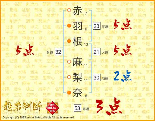 赤(7画)羽(6画)根(10画) 麻(11画)梨(11画)奈(8画)