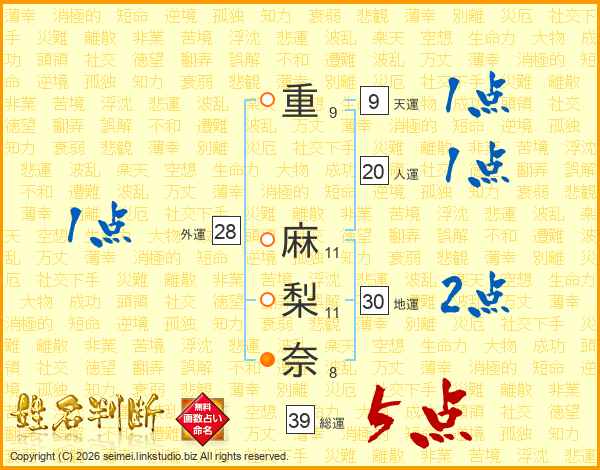 重(9画) 麻(11画)梨(11画)奈(8画)