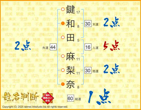 鍵(17画)和(8画)田(5画) 麻(11画)梨(11画)奈(8画)