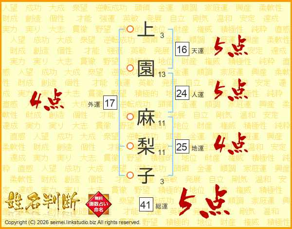 上園麻梨子さんの総運は41画の5点!