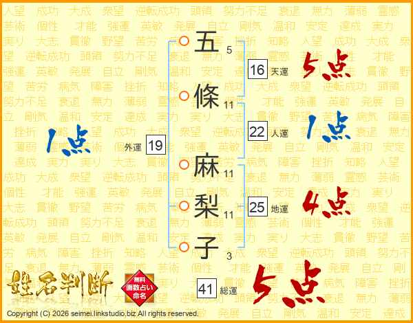 五條麻梨子さんの総運は41画の5点!
