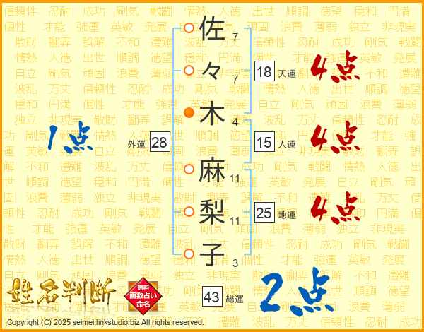 佐々木麻梨子さんの総運は43画の2点!