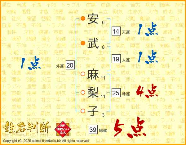 安武麻梨子さんの総運は39画の5点!