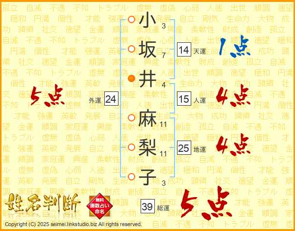 小(3画)坂(7画)井(4画) 麻(11画)梨(11画)子(3画)
