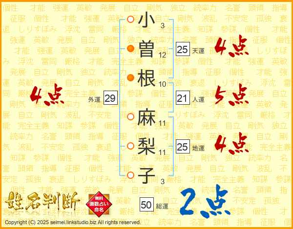 小(3画)曽(12画)根(10画) 麻(11画)梨(11画)子(3画)