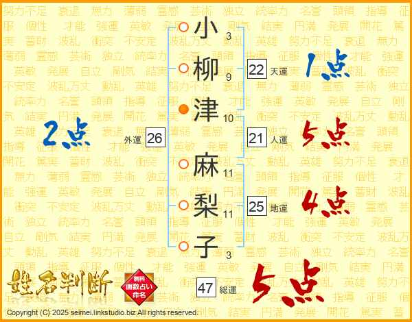 小柳津麻梨子さんの総運は47画の5点!