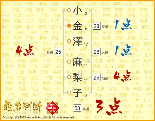 小(3画)金(8画)澤(17画) 麻(11画)梨(11画)子(3画)