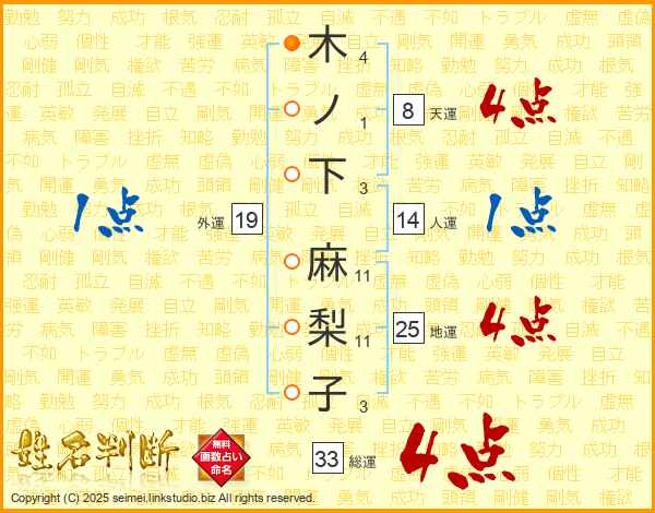 木(4画)ノ(1画)下(3画) 麻(11画)梨(11画)子(3画)