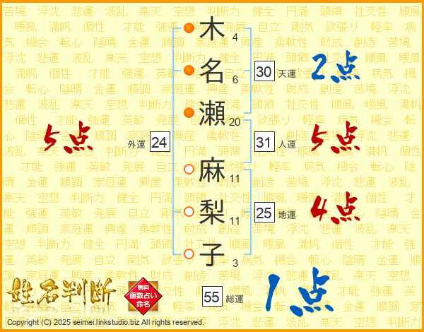 木(4画)名(6画)瀬(20画) 麻(11画)梨(11画)子(3画)
