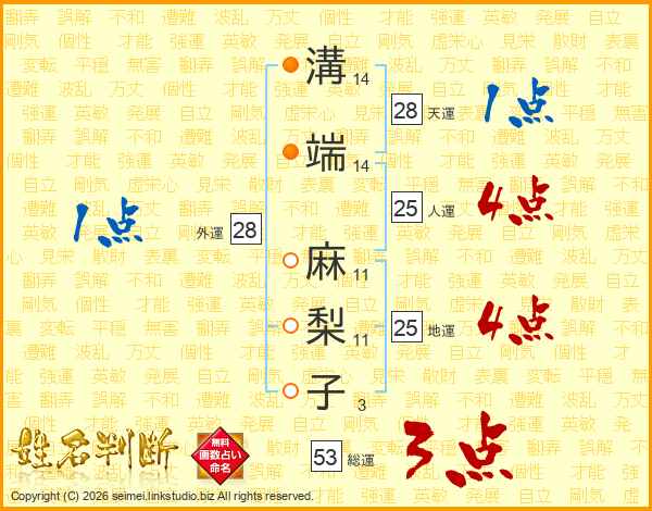 溝(14画)端(14画) 麻(11画)梨(11画)子(3画)