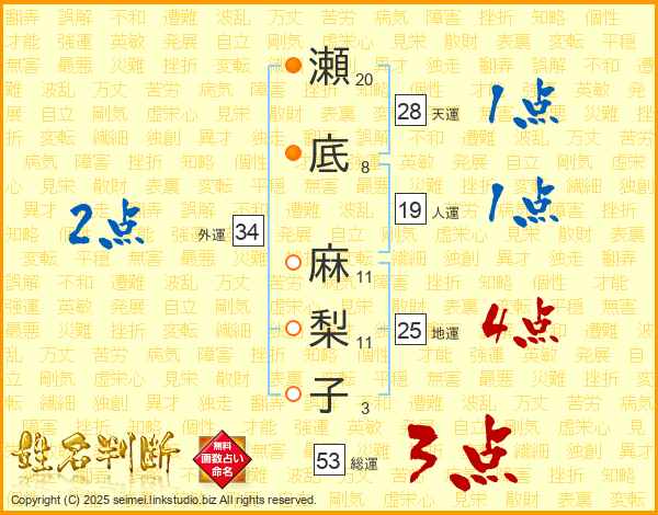 瀬(20画)底(8画) 麻(11画)梨(11画)子(3画)