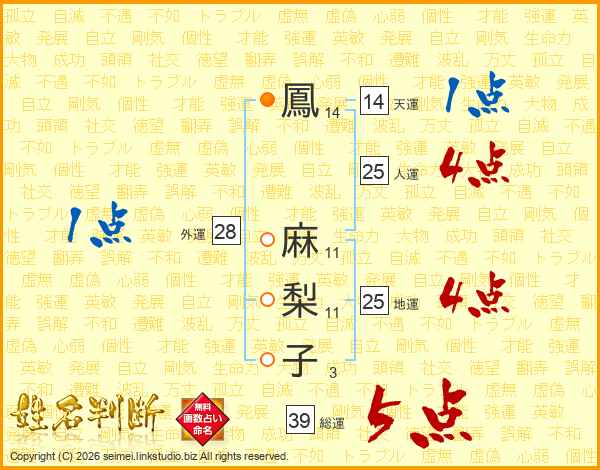 鳳(14画) 麻(11画)梨(11画)子(3画)