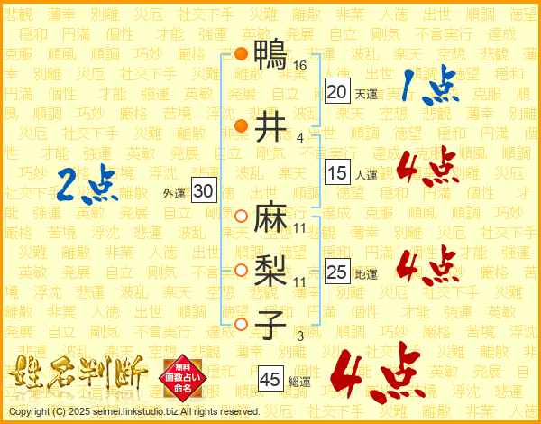 鴨(16画)井(4画) 麻(11画)梨(11画)子(3画)