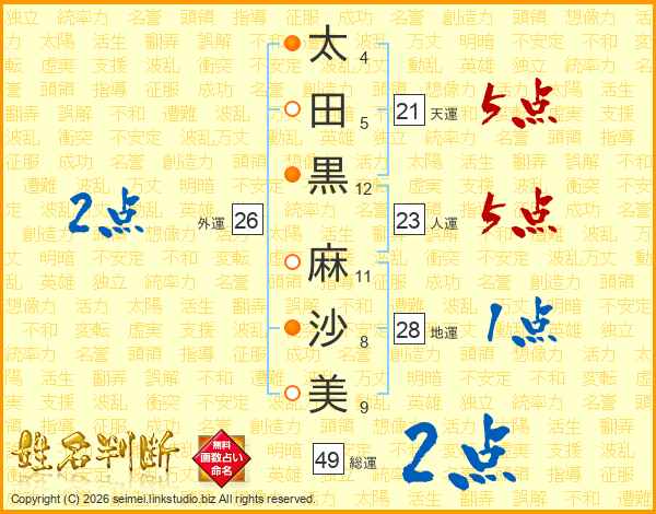 太田黒麻沙美さんの天運は21画の5点!