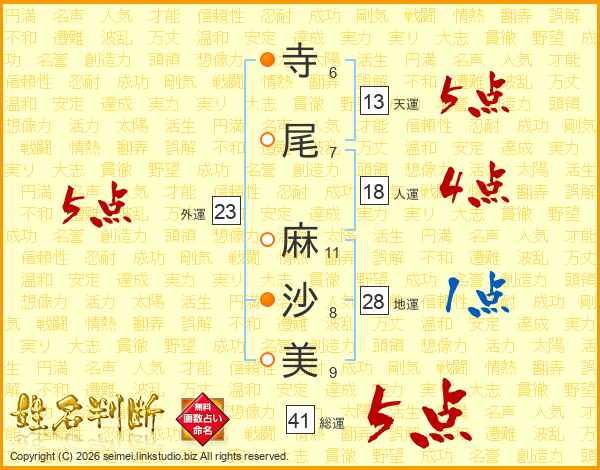 寺(6画)尾(7画) 麻(11画)沙(8画)美(9画)