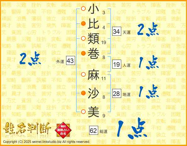 小(3画)比(4画)類(19画)巻(8画) 麻(11画)沙(8画)美(9画)