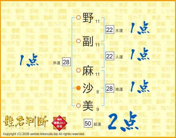 野(11画)副(11画) 麻(11画)沙(8画)美(9画)