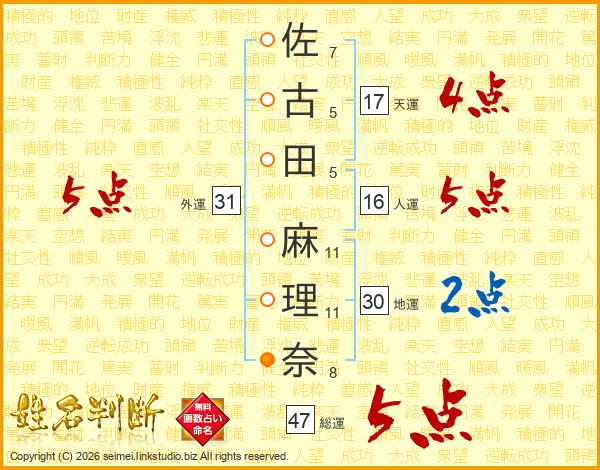 佐(7画)古(5画)田(5画) 麻(11画)理(11画)奈(8画)