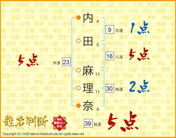内(4画)田(5画) 麻(11画)理(11画)奈(8画)