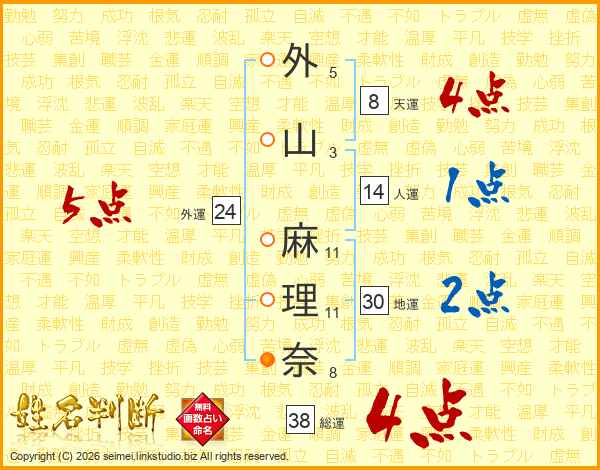 外(5画)山(3画) 麻(11画)理(11画)奈(8画)