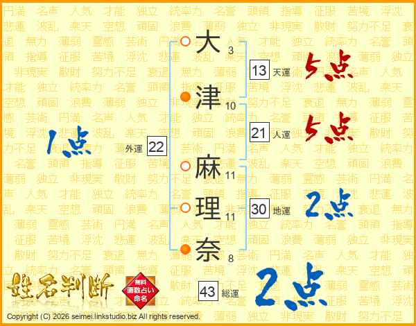大(3画)津(10画) 麻(11画)理(11画)奈(8画)