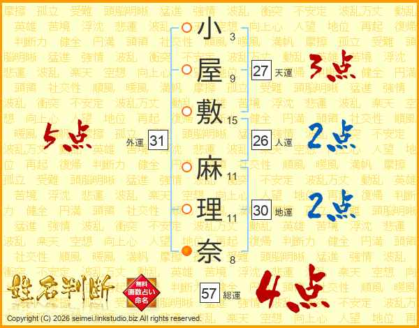 小屋敷麻理奈さんの総運は57画の4点!