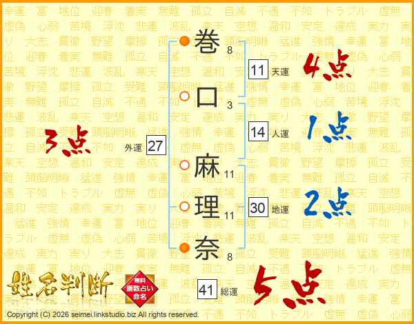 巻(8画)口(3画) 麻(11画)理(11画)奈(8画)