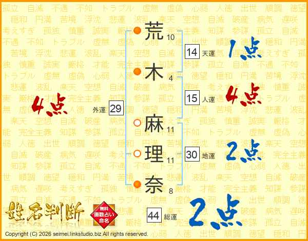 荒(10画)木(4画) 麻(11画)理(11画)奈(8画)