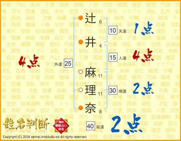 辻(6画)井(4画) 麻(11画)理(11画)奈(8画)